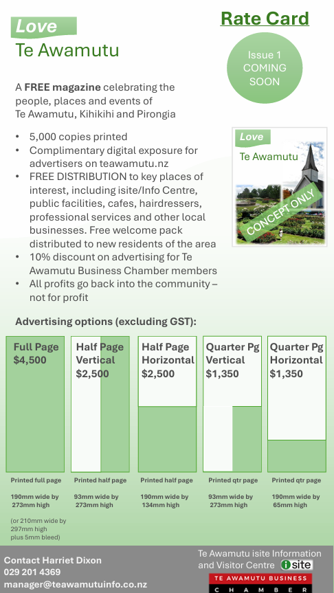 FREE DISTRIBUTION to key places of interest incl. isite, public facilities, cafes, hairdressers, professional services and other local businesses. Free welcome pack distributed to new residents of Te Awamutu